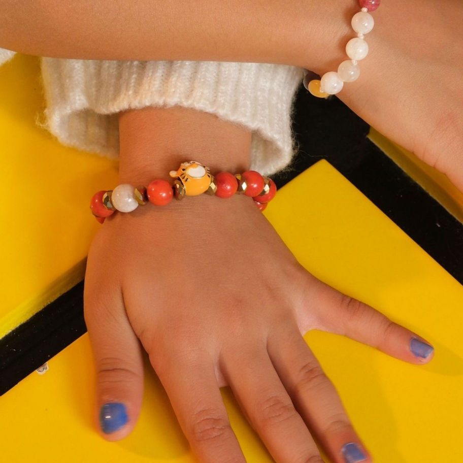 Miniklere özel olarak tasarlanan bu zarif çocuk bilekliği, mercanın çocuklarda koruyucu bir sembol olarak bilinen sıcak enerjisi ile aytaşının yumuşak sezgi ve içsel denge hissini bir araya getirirken, aralardaki hematit tasarıma modern bir denge dokunuşu katar. Esnek elastik yapısı sayesinde hafif, konforlu ve günlük kullanıma uygundur. Kaplan charm ise bilekliğe güçlü, enerjik ve karakterli bir detay ekler.
