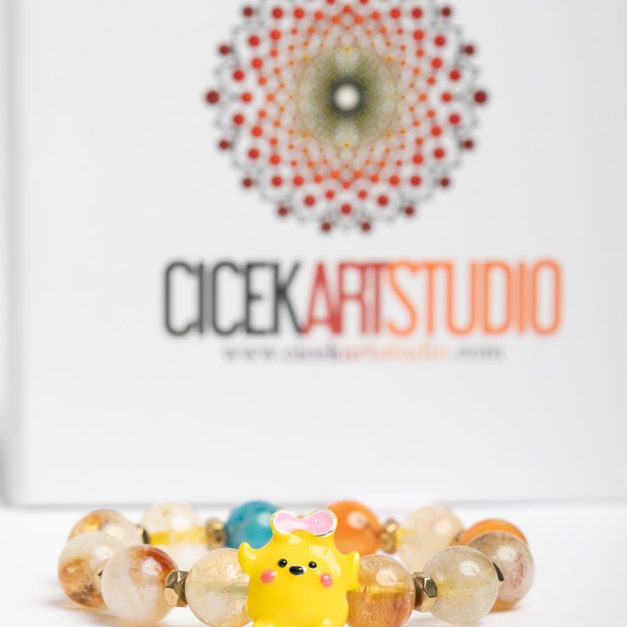 Bu bileklik, Sitrin, Hematit, Apatit ve Turuncu Akik gibi doğal taşlarla yapılmış, üzerinde sarı renkli bir charm (süs) bulunan bir tasarımdır. Bileklik, çift kat elastik ip kullanılarak üretilmiş olup, geniş yaş aralığına uygun ölçü seçenekleri sunmaktadır.